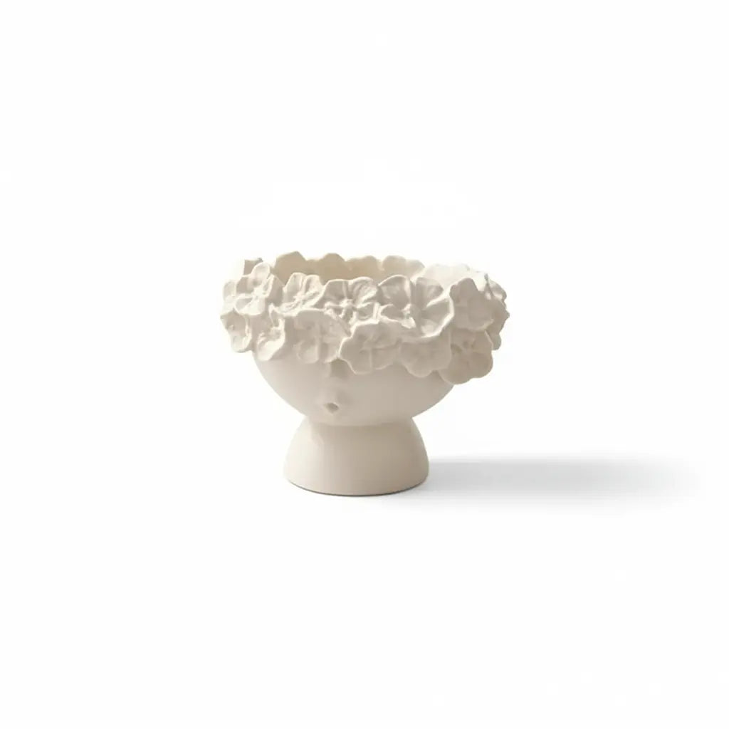 The sculpted female face and flower crown transform a utilitarian object into a sculpture, made of Jesmonite, a water and stain resistant material, this object is perfect for dried branches or fresh flowers or even candles.