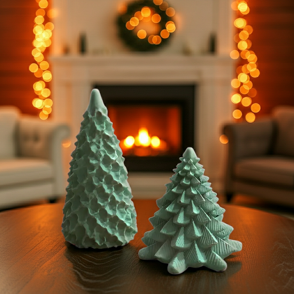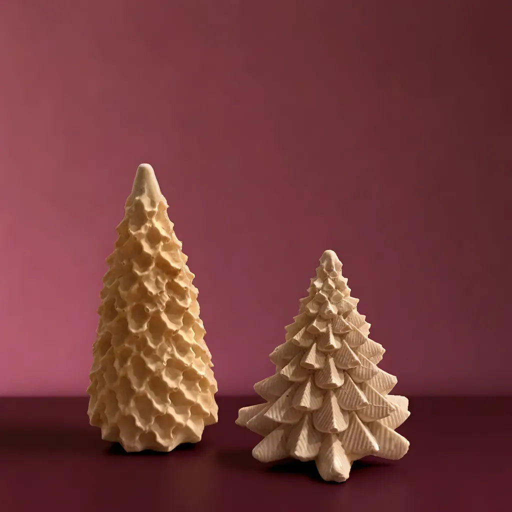 O Duo Abeti, da coleção Holly Chaos, reúne duas interpretações do clássico pinheiro natalício - o Abeti, alto e minimalista, e o Abeti Large, mais largo e detalhado. Feitos à mão em jesmonite, complementam-se na forma e na presença, refletindo o equilíbrio entre o essencial e o ornamental, o simples e o expressivo.